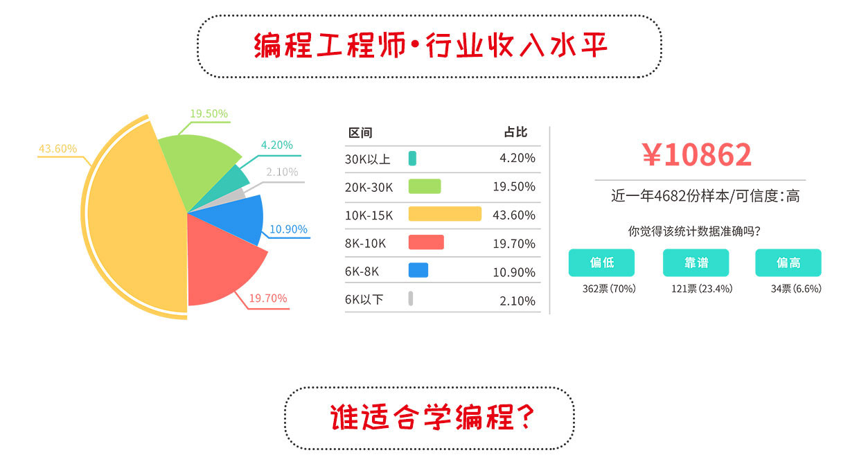 通过对国内主流招聘网站数据统计,编程工程师月平均薪资高达10862 元,较同年龄段其他行业工作者收入高出40%~65%,而且随着技术的提升,步入管理层的机会也更大,更有机会出任CTO,成为人生赢家。