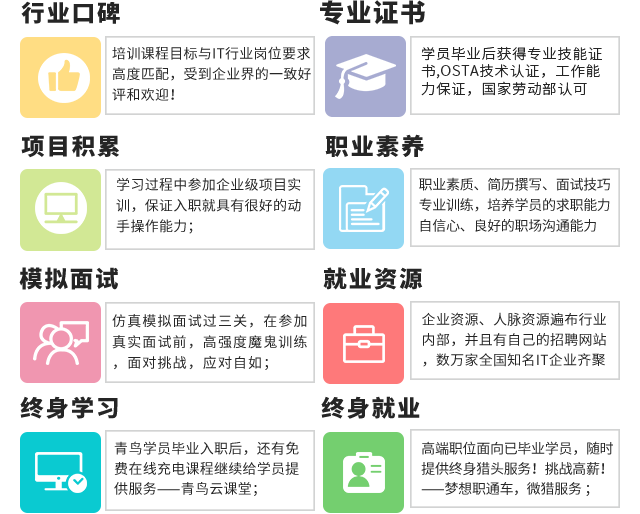 北大青鸟学员从报名开始就进入了我们整套的就业流程服务流程,在学习过程中,学员的技术能力、项目经验和职业素养得到全面提升,同时北大青鸟还为学员提供求职面试指导和就业推荐,当学员进入试用期之后,中心会依然关注学员的情况,随时提供学员需要的帮助。